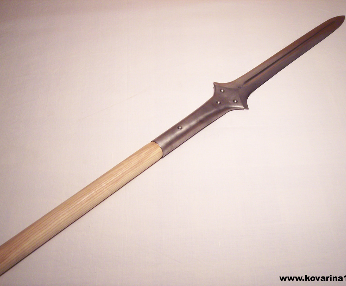 kalená leštěná čepel odlehčená žlábkem,nýtovaná, drátkovaná,jasanová patinovaná násada