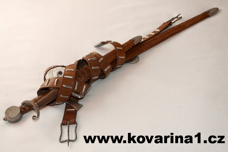 souprava pro meč a dýku, kožené ručně šité a mořené pochvy,nákončí a obůstky kov, pásy zdobené raženými cínovanými kovovými prvky, kované spony a koncovky pásů