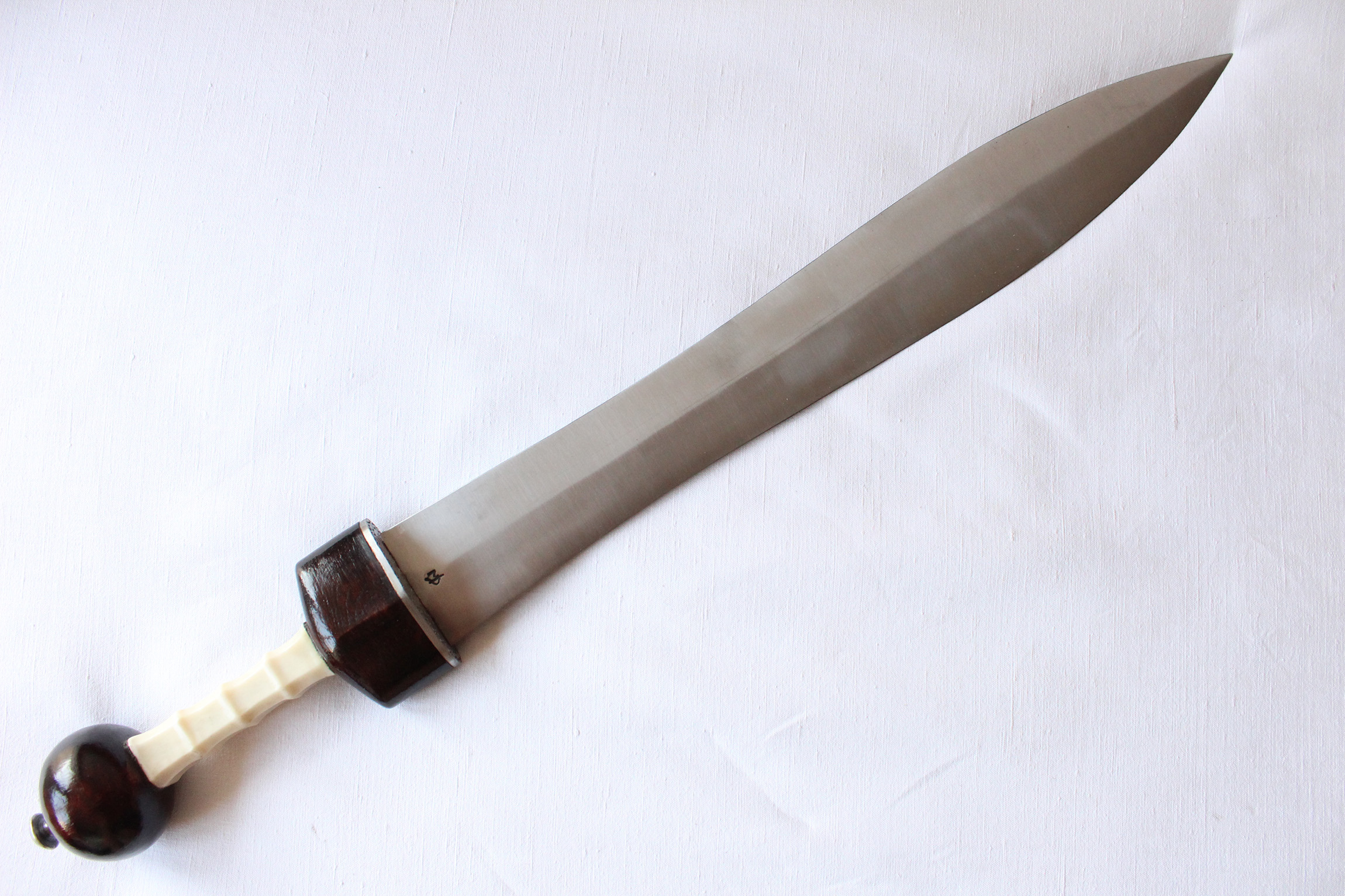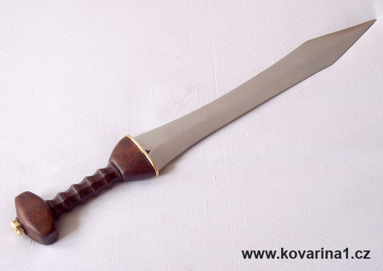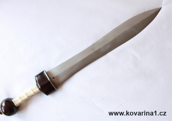 používáný Římany ve starověku,dvojbřitá čepel s žebrem a tuhým hrotem,jílec kostěný,souprava dřevěná mořená,kování železné