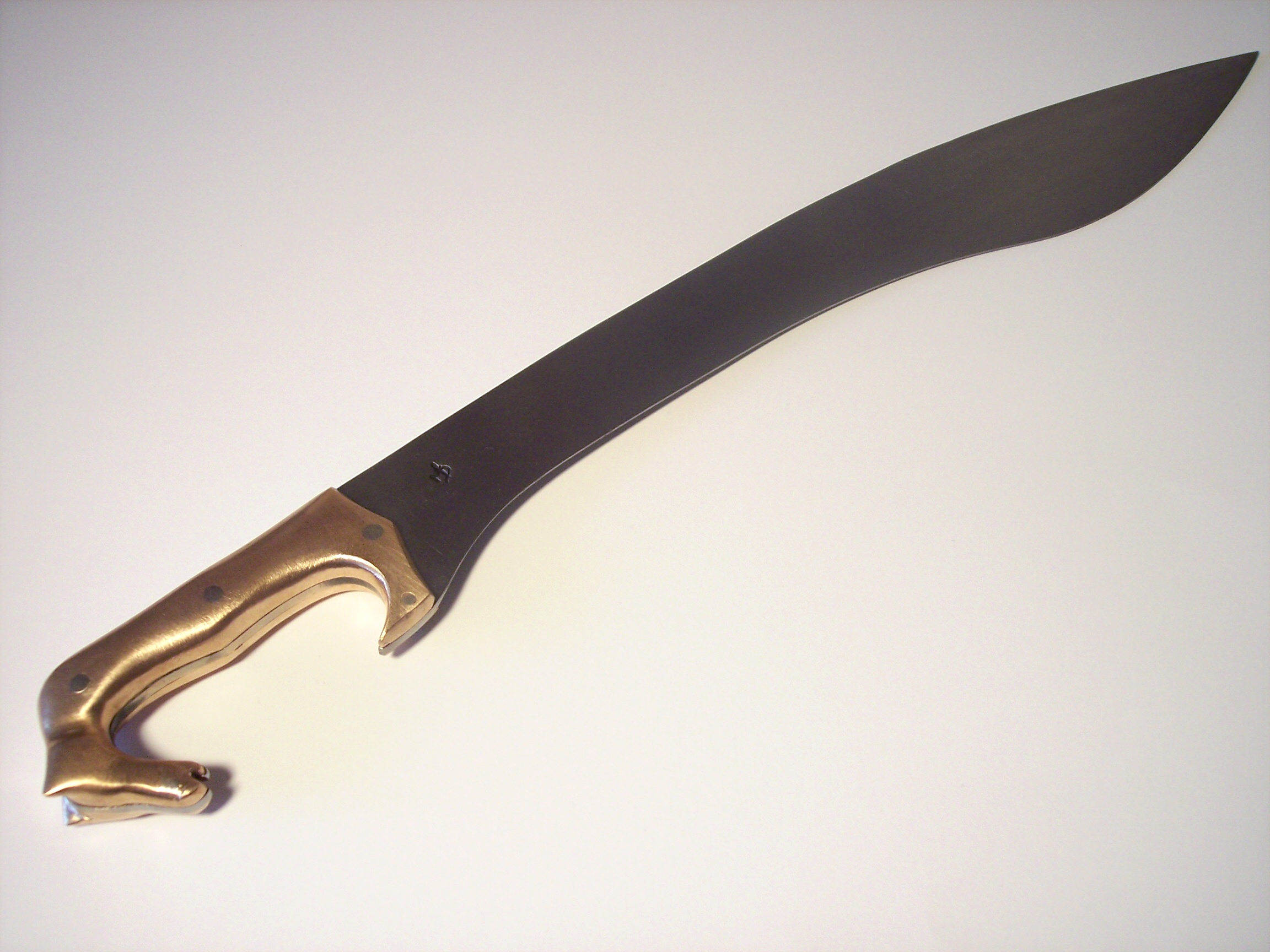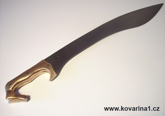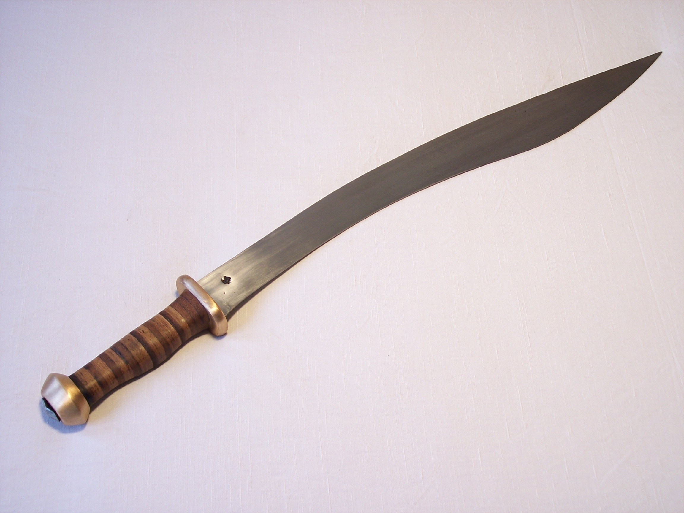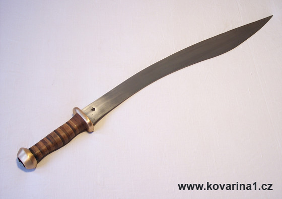 používáná v Řecku ve starověku,jednobřitá čepel s hrotem,jílec bronzový nýtovaný,