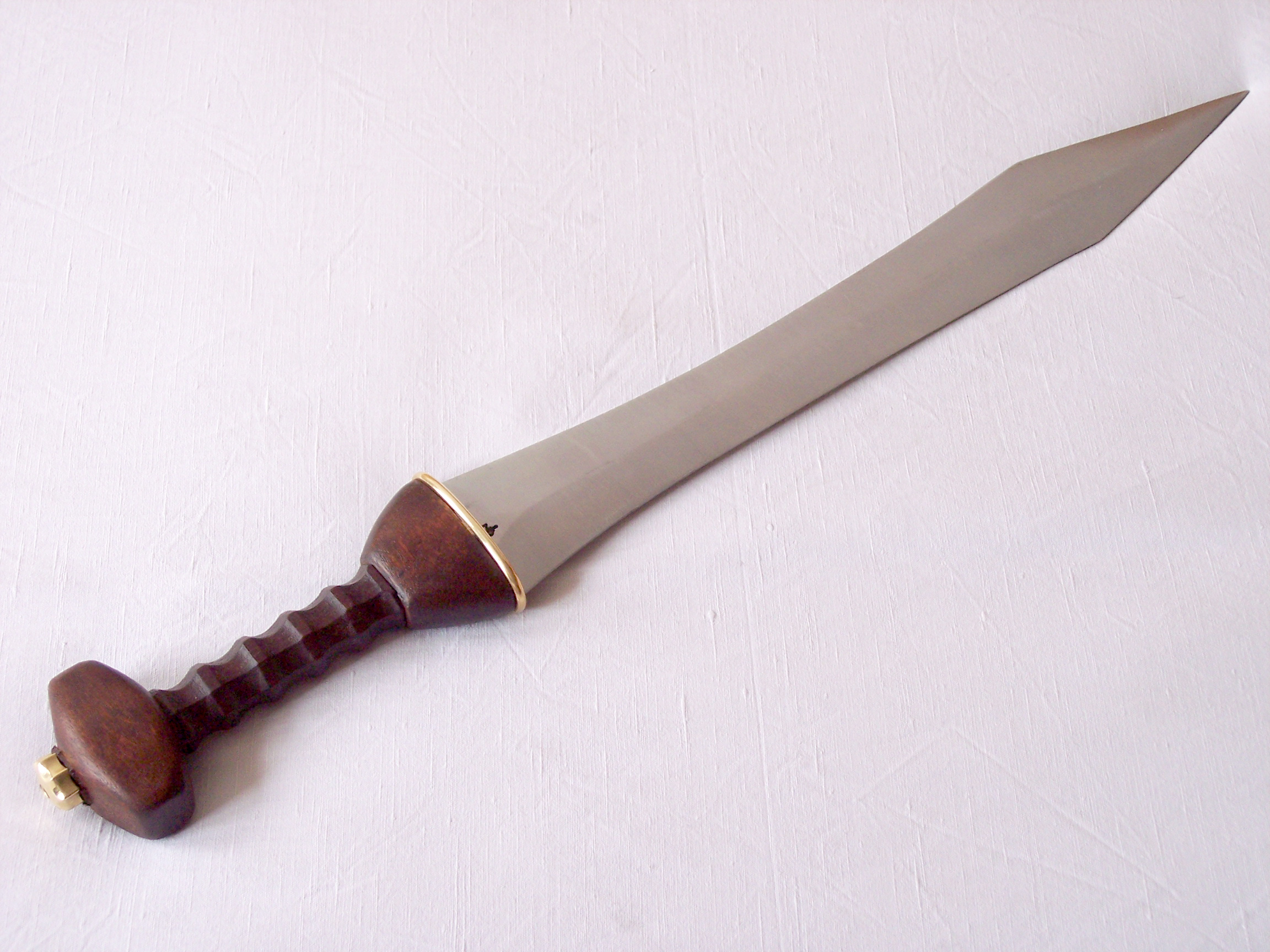 používáný Římany ve starověku,dvojbřitá čepel s žebrem a hrotem,jílec dřevěný,mořený, souprava dřevěná mořená,zdobená mosazí