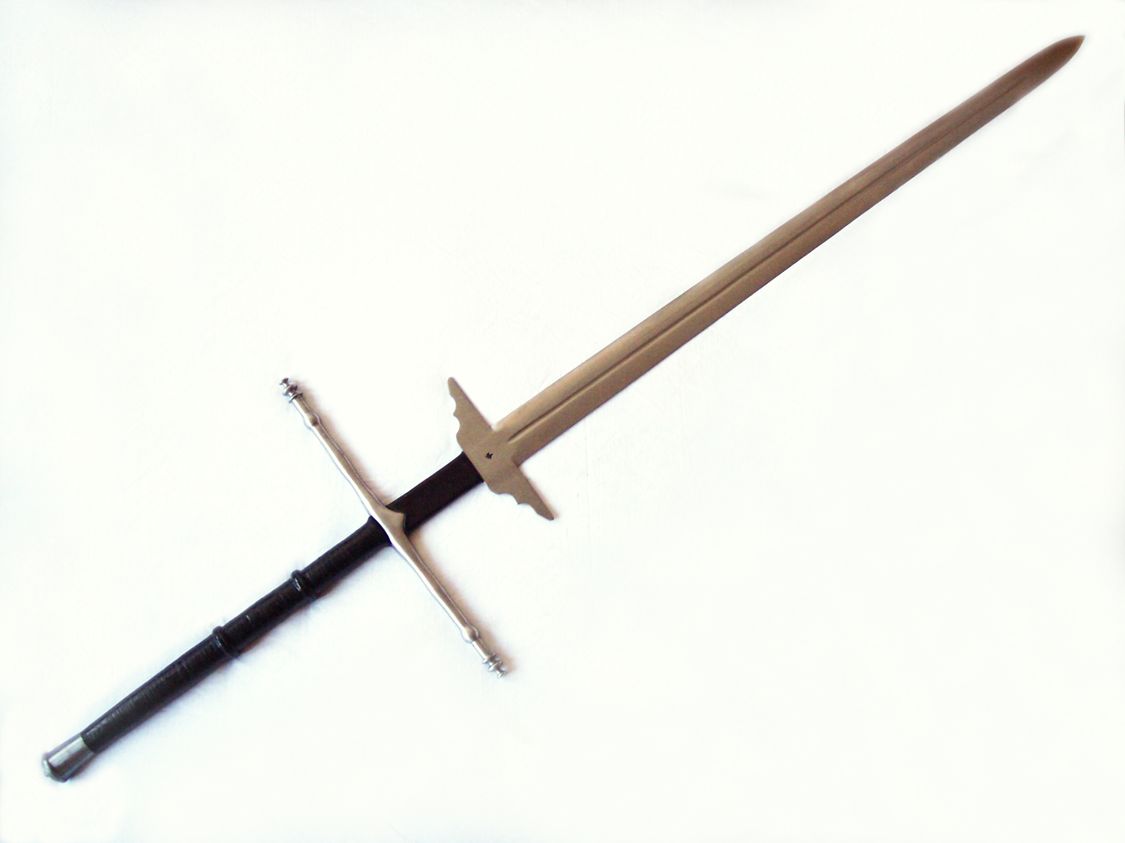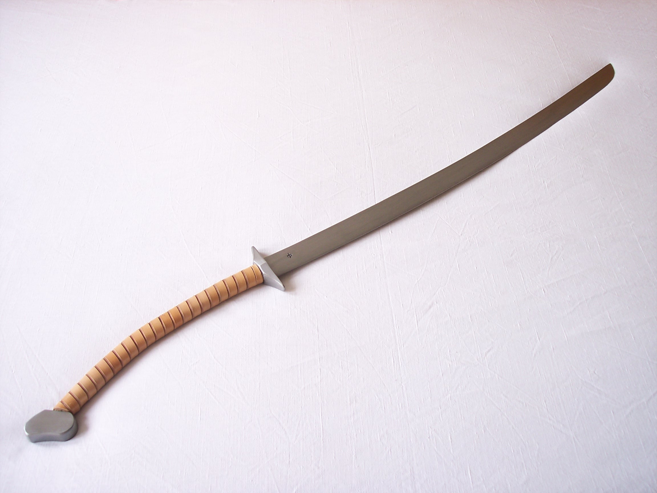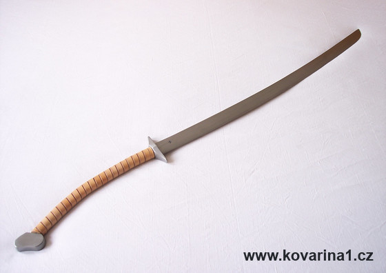 fantazy meč,čepel esovitě zahnutá,jílec omotaný kůží, souprava drátkovaná,hlavice nýtovaná