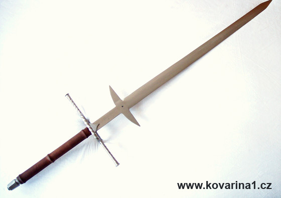používáný v 14-15.století,čepel šestiboká s hrotem, zdobené leptem, jílec narážené kroužky, souprava zdobená řezbou,hlavice probíjená nýtovaná