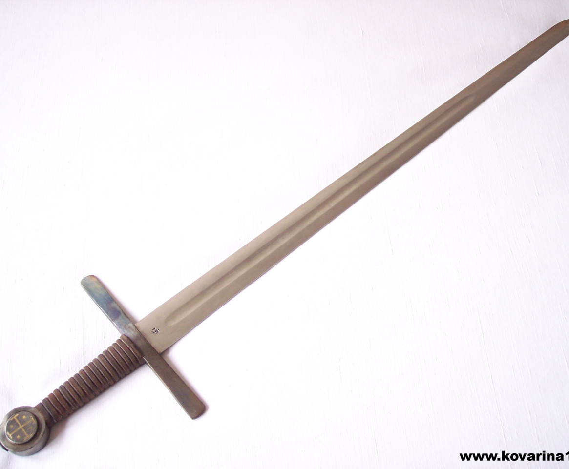 používáný ve 14.století,čepel s hrotem odlehčená žlábkem,jílec narážené kroužky – rýhovaný, zdobená hlavice probíjená nýtovaná, souprava modřená