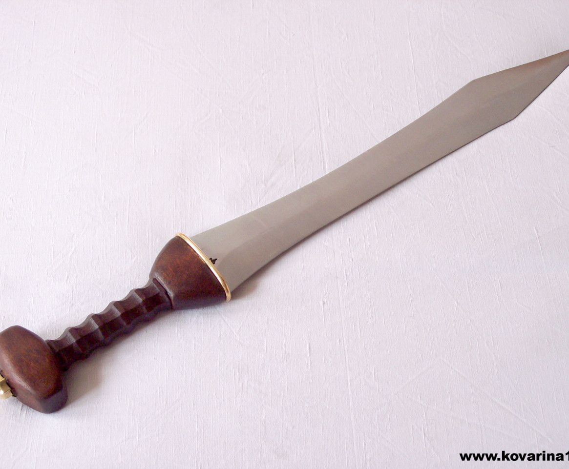 používáný Římany ve starověku,dvojbřitá čepel s žebrem a hrotem,jílec dřevěný,mořený, souprava dřevěná mořená,zdobená mosazí