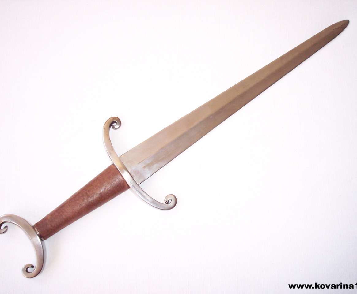 čepel kosočtvercového průřezu,jílec omotán kůží,hlavice nýtována
