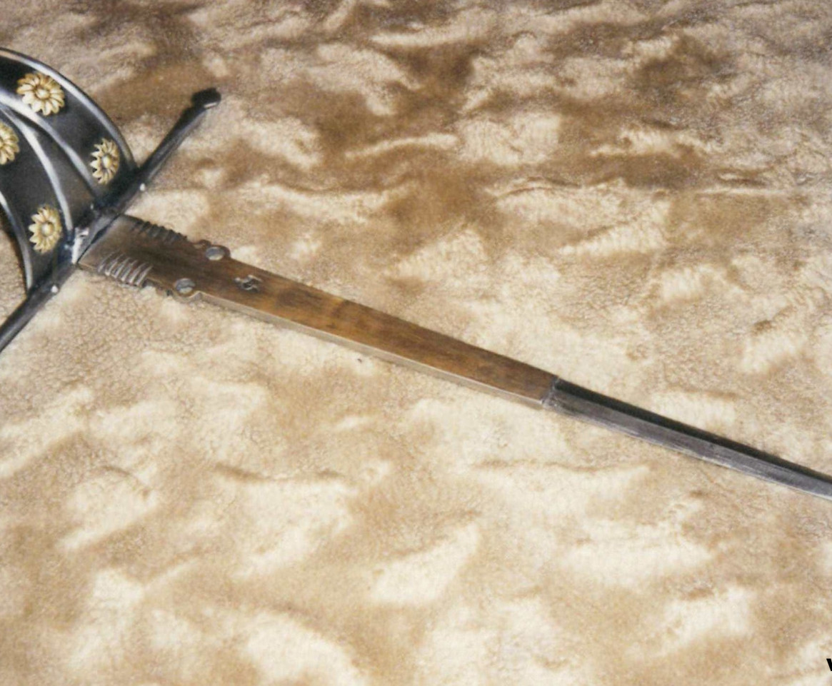 čepel přesazené ostří,příčka spojena se zdobeným plechovým zvonem,jílec torzírovaný drát,rotační nýtovaná hlavice