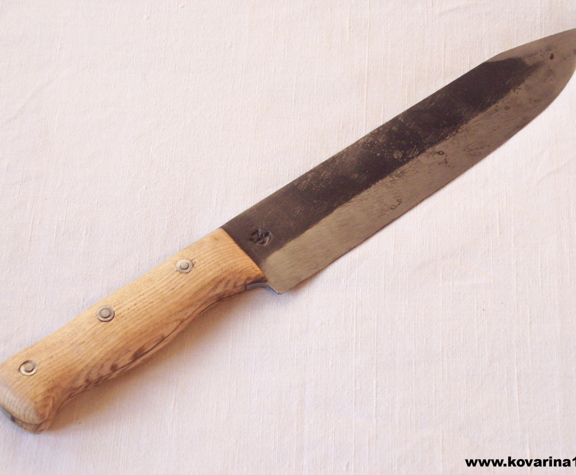 čepel uhlíková ocel,jílec dřevěný nýtováný,hřbet zdobený vlnou