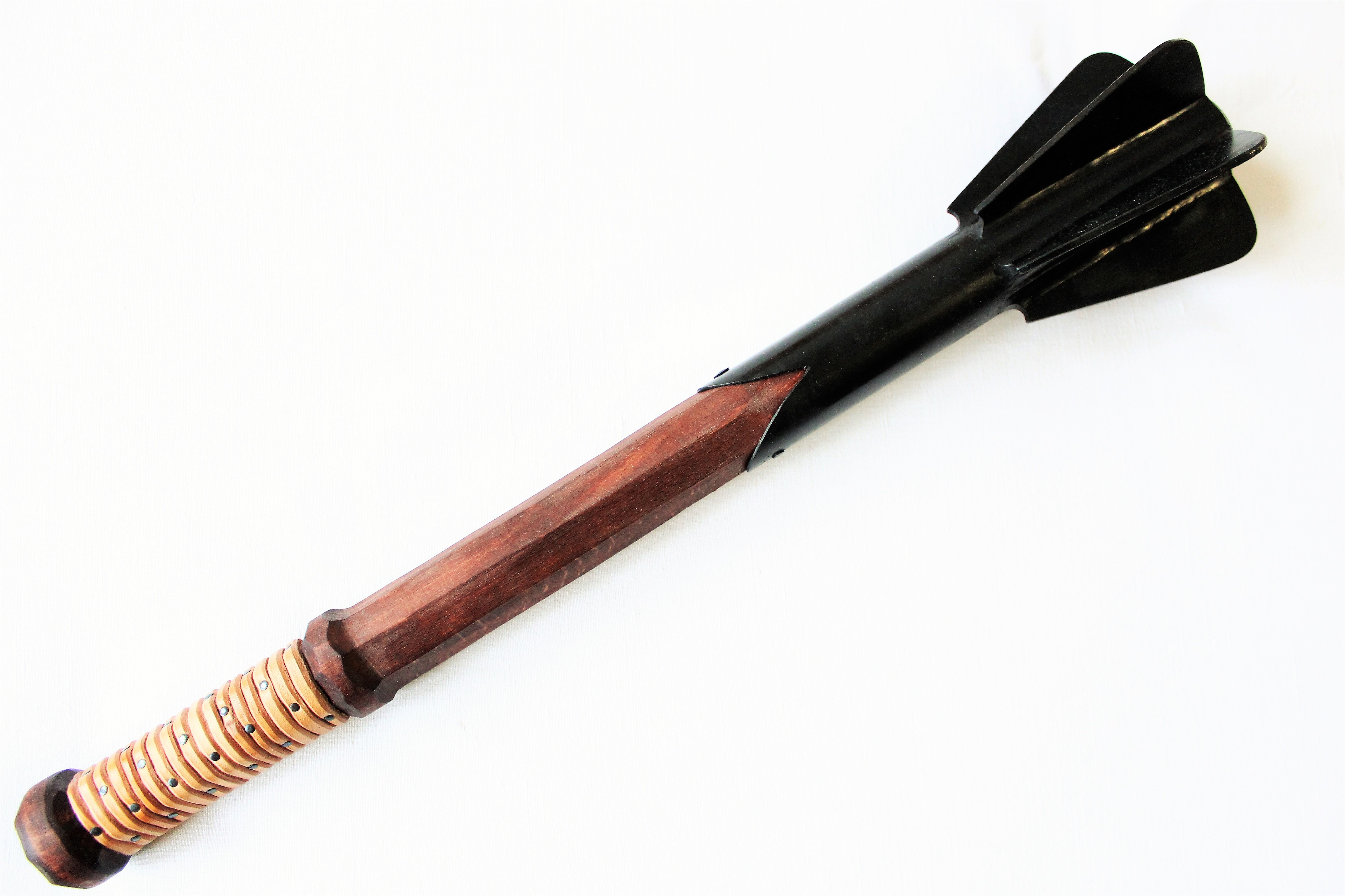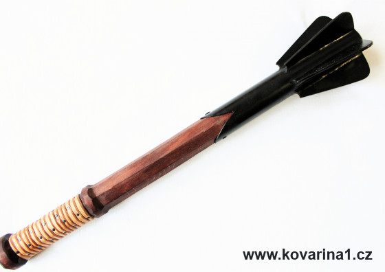 šestiperý, černěný, s dřevnou násadou,jílec omotaný kůží
