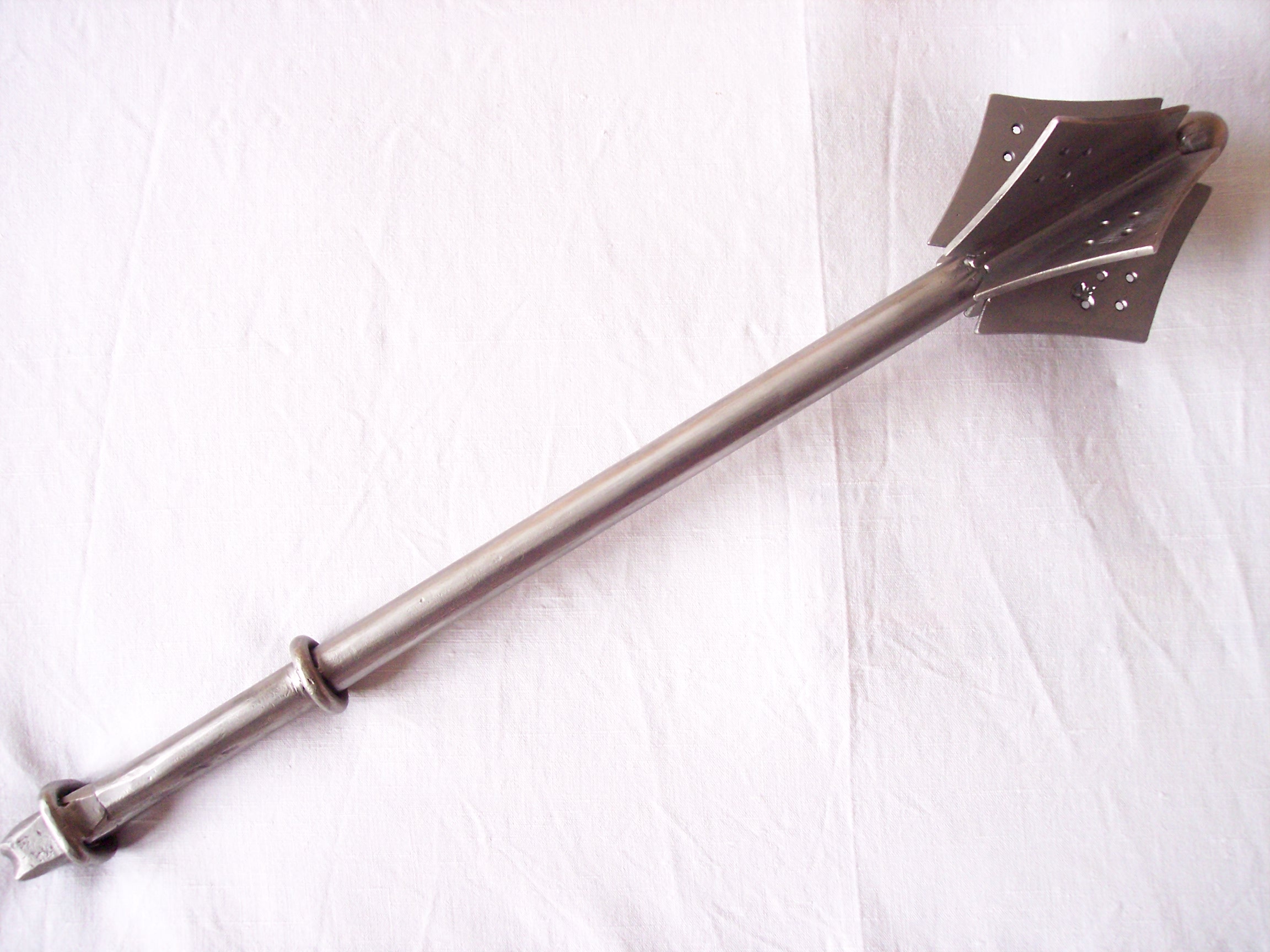 celoželezný.šestiperý,pera děrovaná, s kulatou hlavicí,povrch černěný,jílec omotaný sametem,velmi odolné provedení