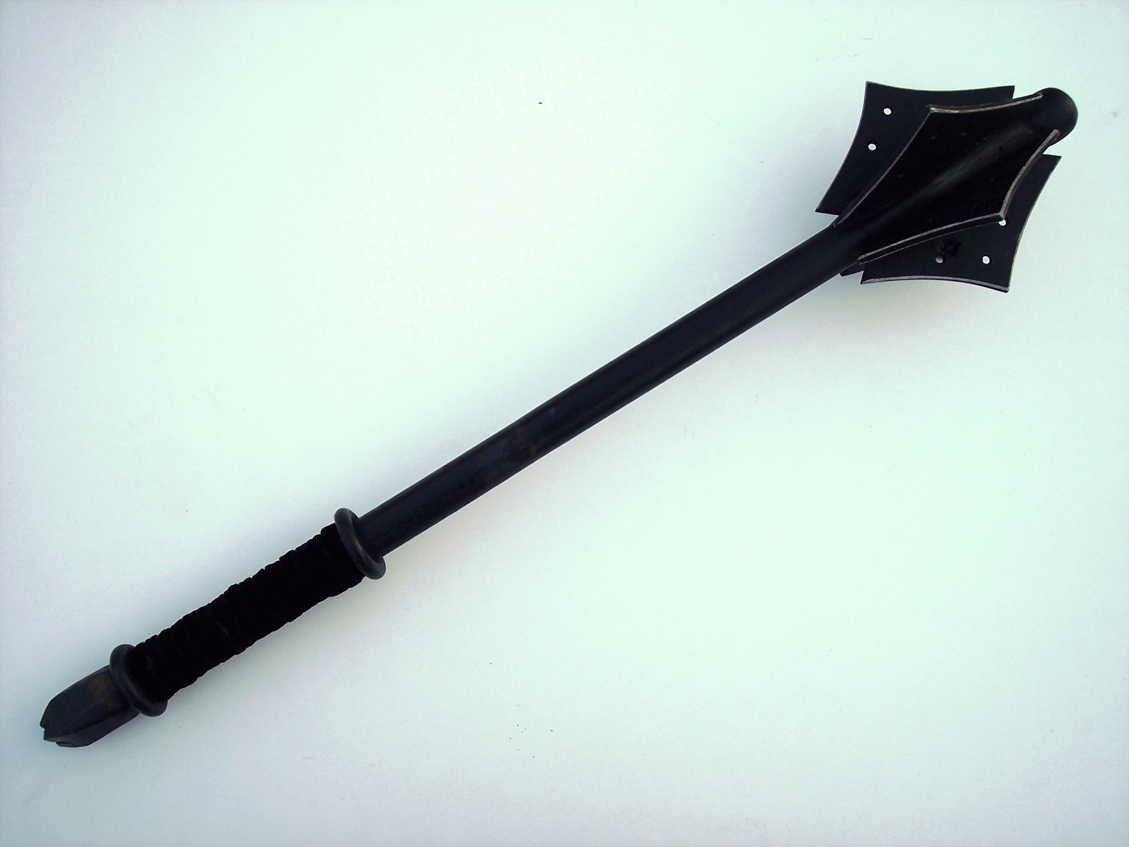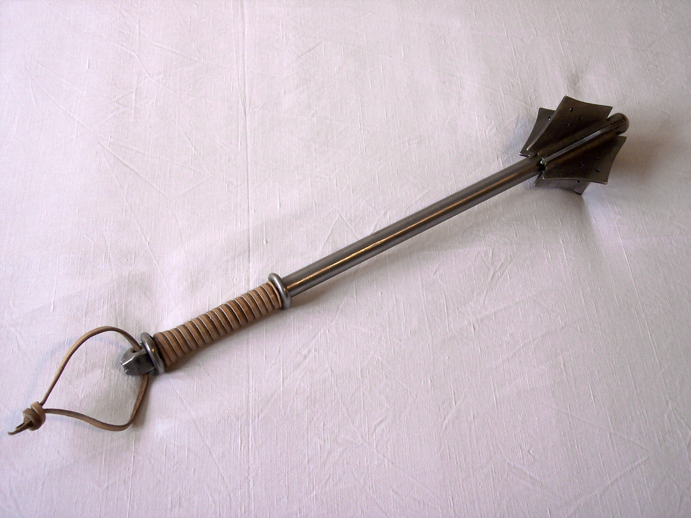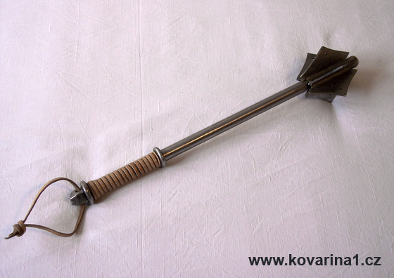 celoželezný šestiperý,pera děrovaná,s kulatou hlavicí, povrch drátkovaný,jílec omotaný kůží,velmi odolné provedení