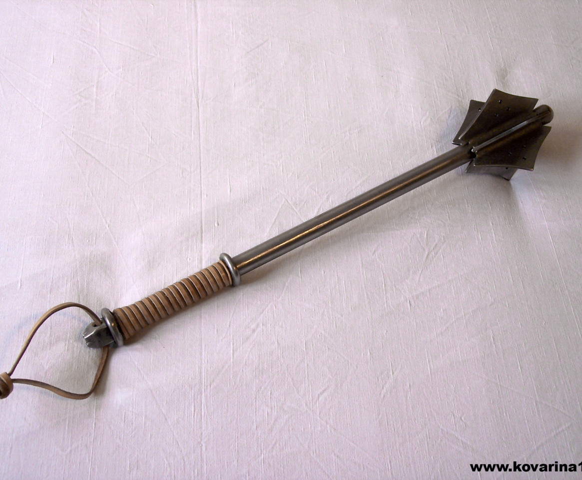 celoželezný šestiperý,pera děrovaná,s kulatou hlavicí, povrch drátkovaný,jílec omotaný kůží,velmi odolné provedení