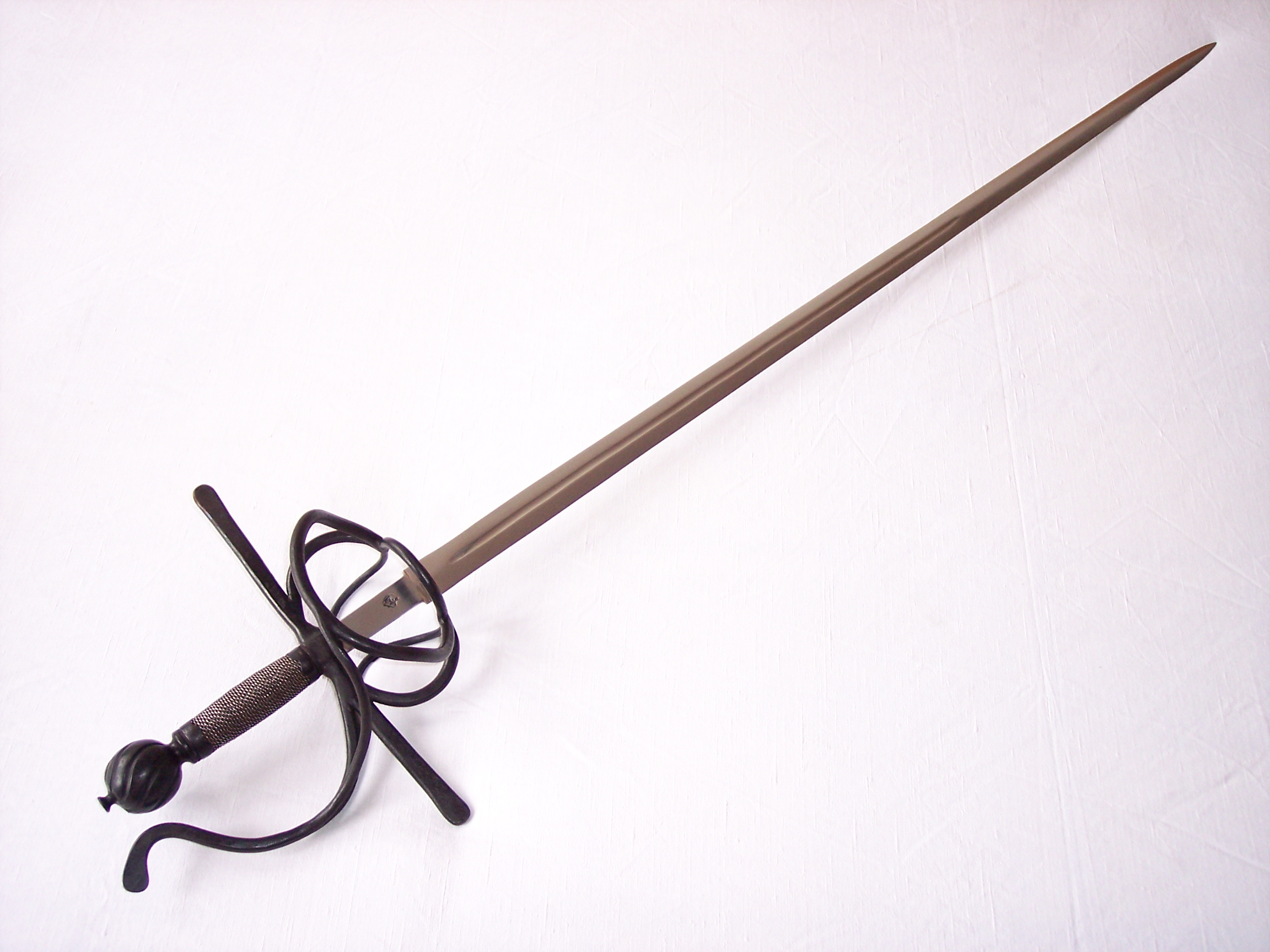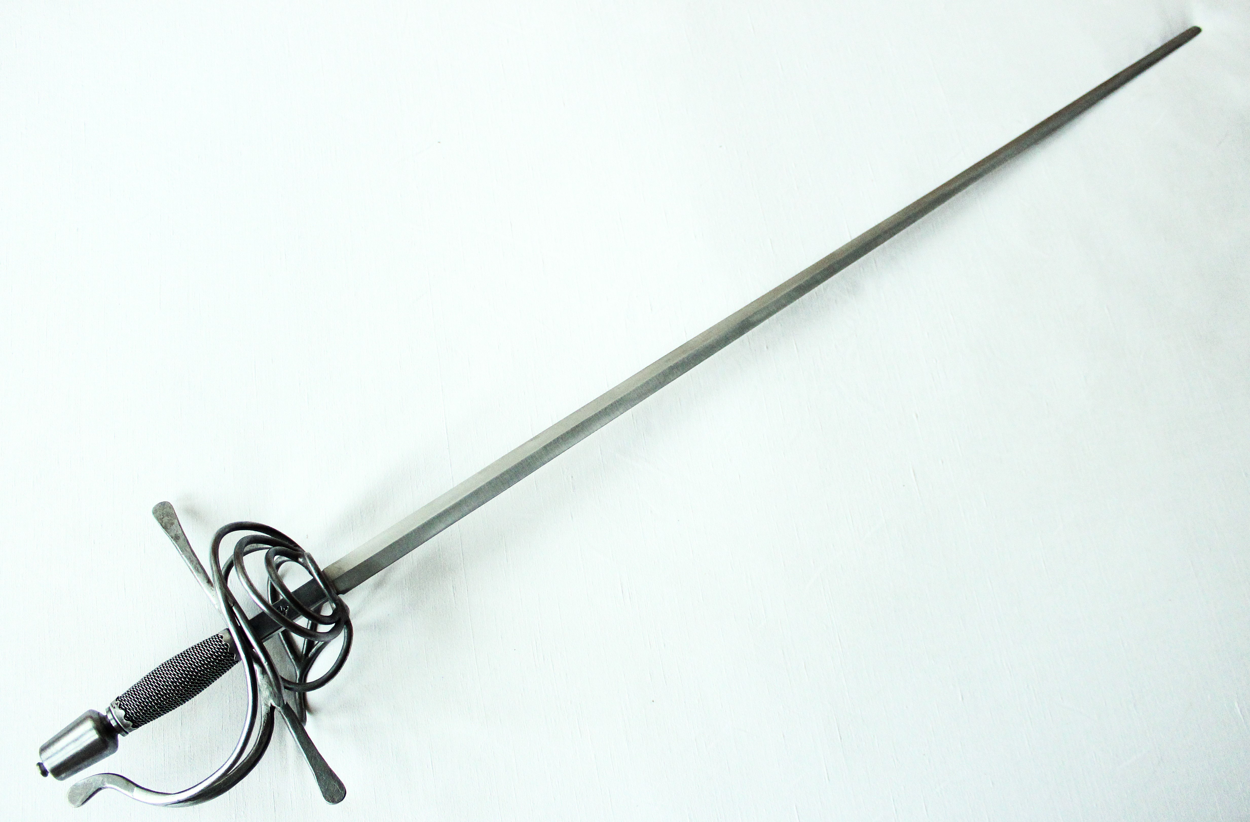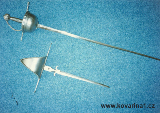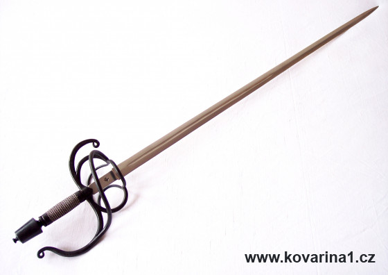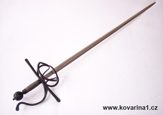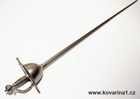 používáno v 16.století,čepel úzká leštěná s drážkou,pletený koš, jílec torzírovaný drát s miskami,hlavice na závit zdobená řezbou, černěno