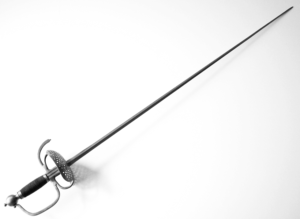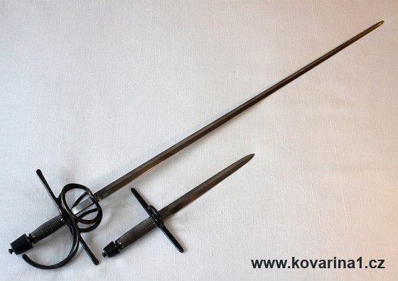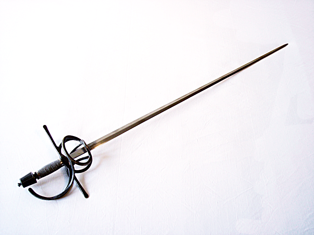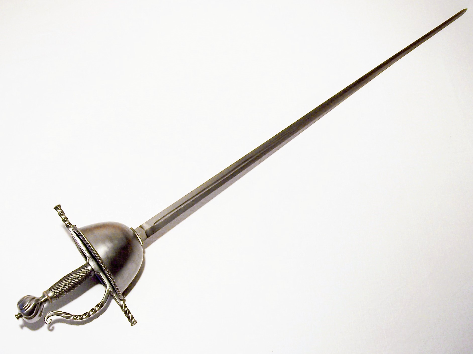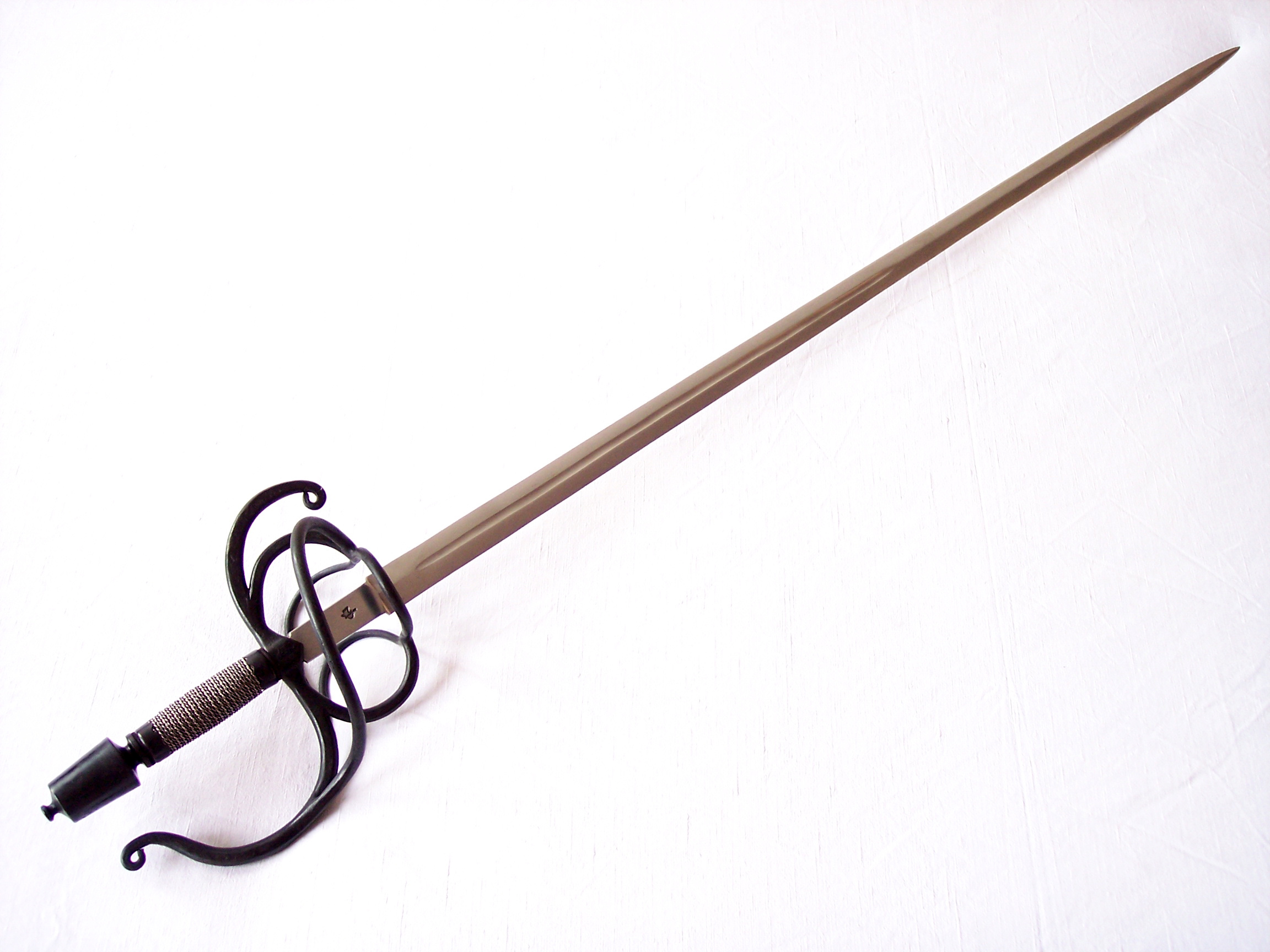 používáno v 16.století,čepel úzká leštěná s drážkou,pletený koš, jílec torzírovaný drát s miskami,hlavice na závit zdobená řezbou, černěno