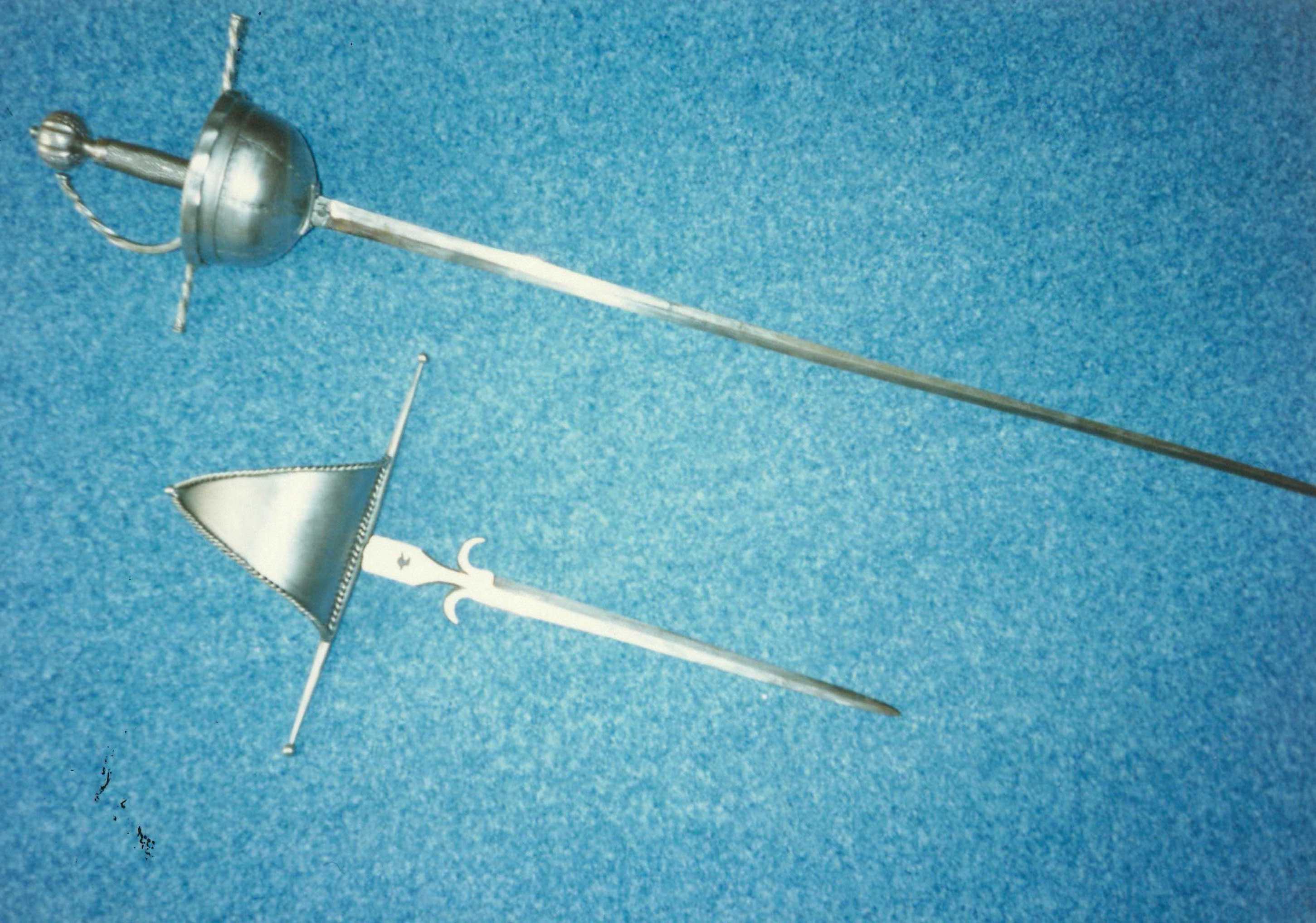 datováno do let 1600-1650,čepele opatřeny žebrem,jílce torzírovaný drát,hlavice leptány,černěno,dobře vyváženo