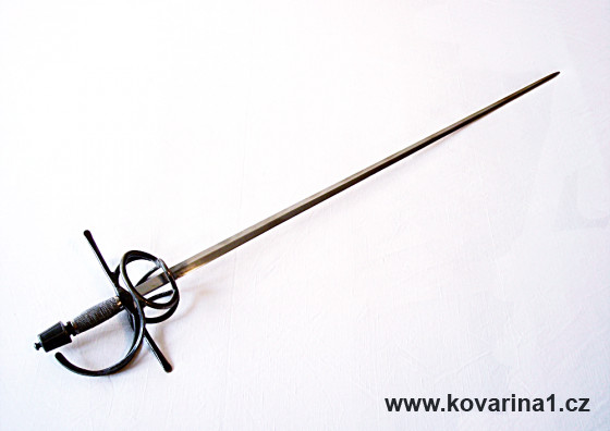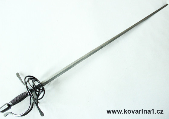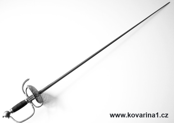 používáno v 16.století,úzká leštěná čepel s drážkou,pletený koš, jílec torzírovaný drát s miskami,kónická hlavice na závit,černěno