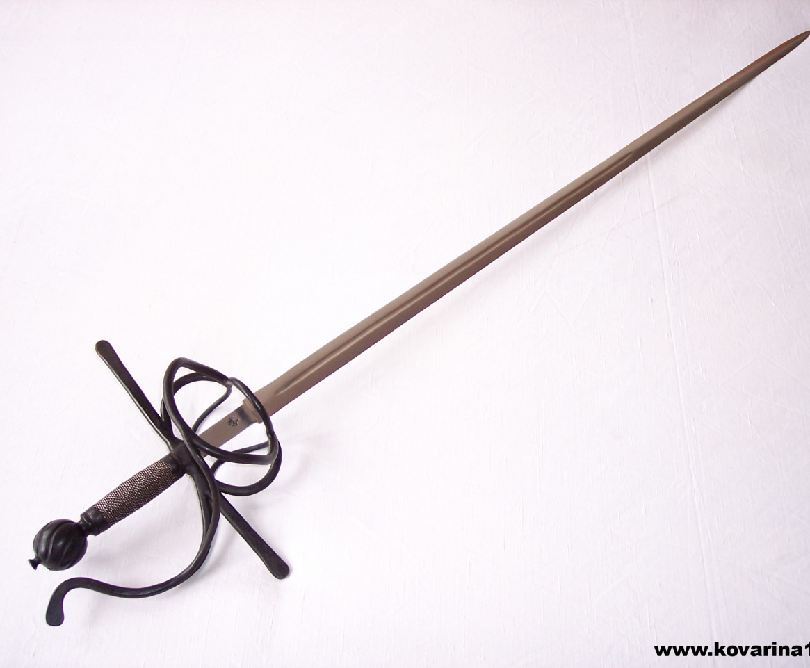 používáno v 16.století,čepel úzká leštěná s drážkou,pletený koš, jílec torzírovaný drát s miskami,hlavice na závit zdobená řezbou, černěno