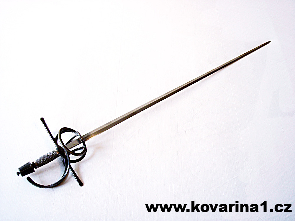 datováno okolo roku 1610,čepel úzká leštěná s žebrem,pletený koš, jílec torzírovaný drát s miskami,kónická hlavice na závit,černěno