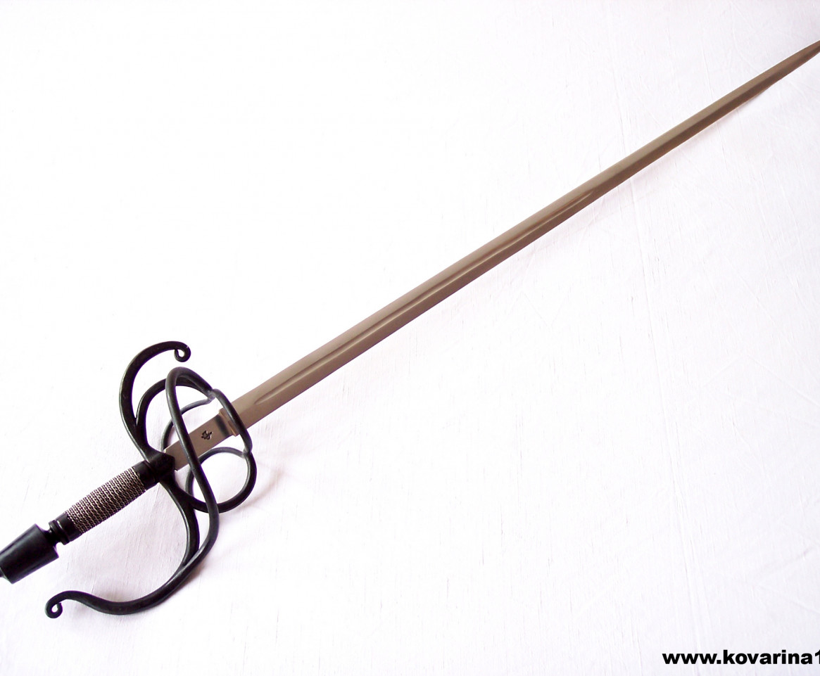 používáno v 16.století,úzká leštěná čepel s drážkou,pletený koš, jílec torzírovaný drát s miskami,kónická hlavice na závit,černěno