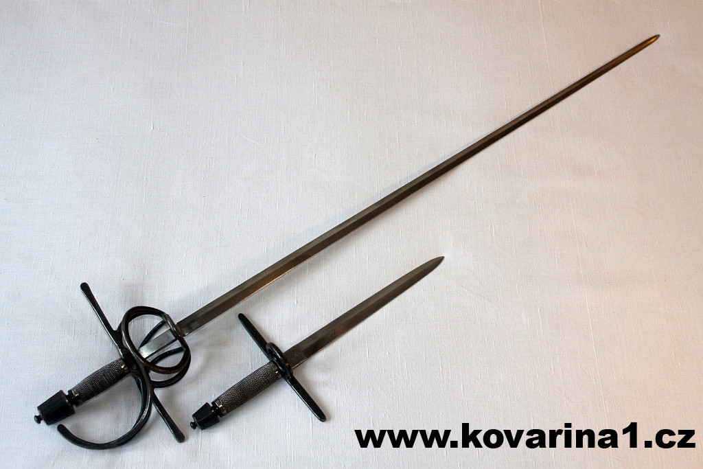 datováno do let 1600-1650,čepele opatřeny žebrem,jílce torzírovaný drát,hlavice leptány,černěno,dobře vyváženo