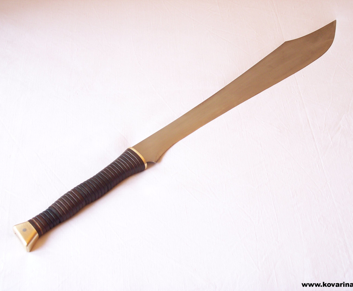 pádná kalená čepel,jílec narážené mořené kožené kroužky, souprava z mosazi,leštěná,výborně ovladatelná,