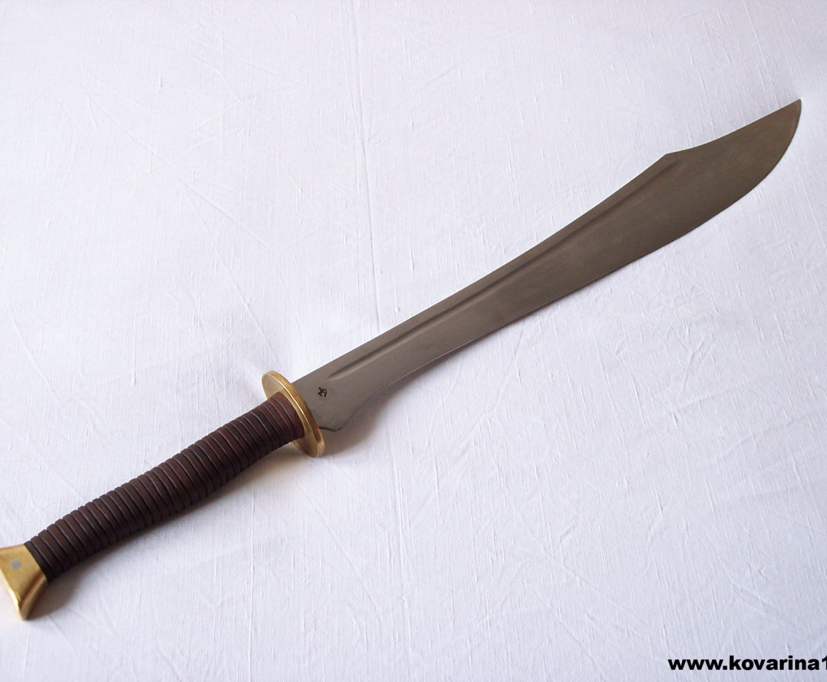 pádná kalená čepel,jílec narážené mořené kožené kroužky, souprava z mosazi,záštita s nakovanou hranou,leštěná,výborně ovladatelná,
