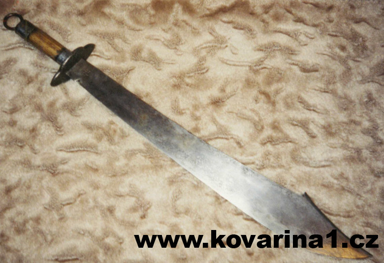 široká pádná čepel se zpětným trnem,jílec dřevěný osazený kovovými prstenci, příčka narážená,patinováno,výborně ovladatelná